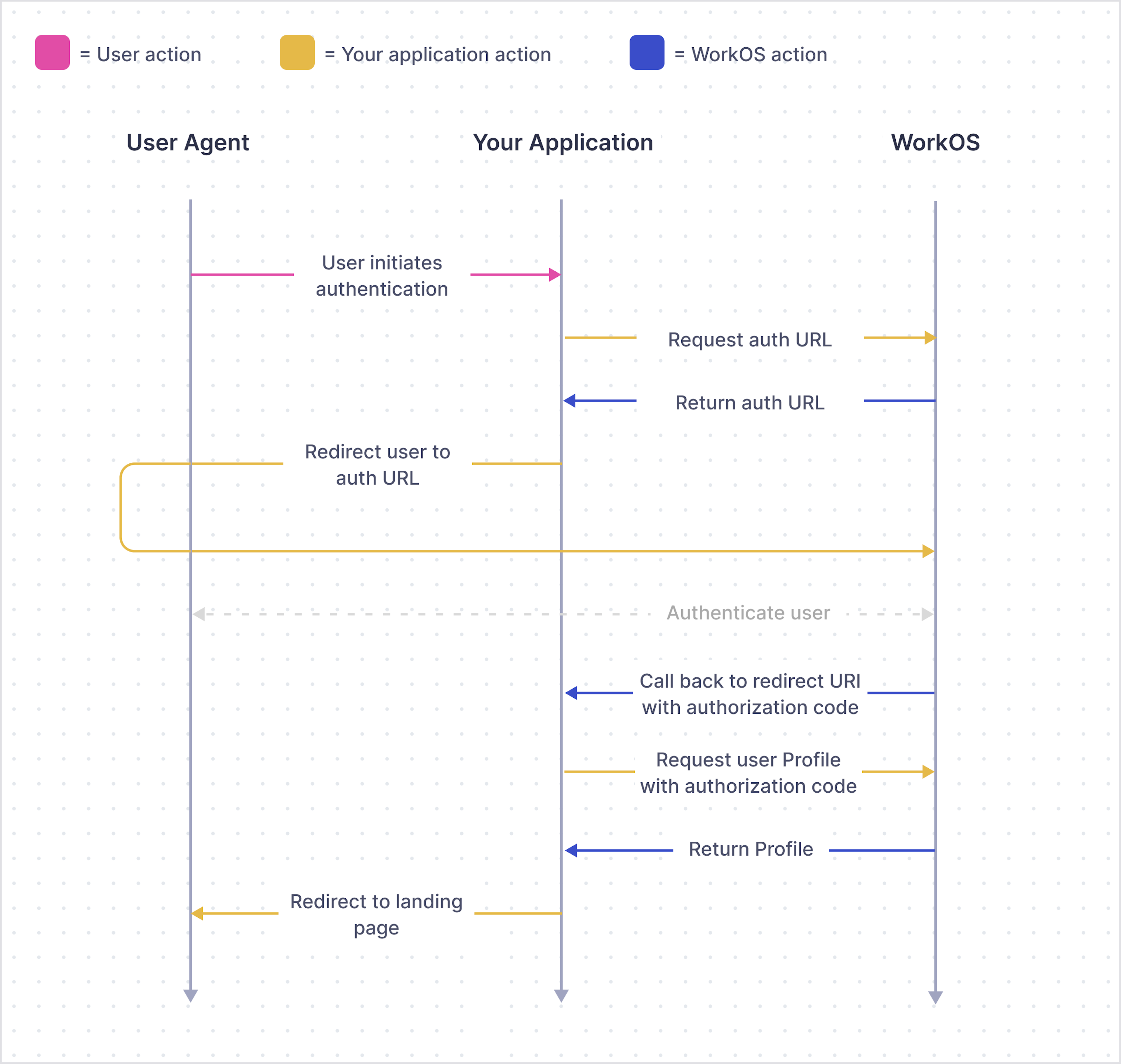 The WorkOS SSO API is modeled to meet the OAuth 2.0 framework specification, abstracting away the underlying authentication handshakes between different IdPs. Check out the sequence of events below.